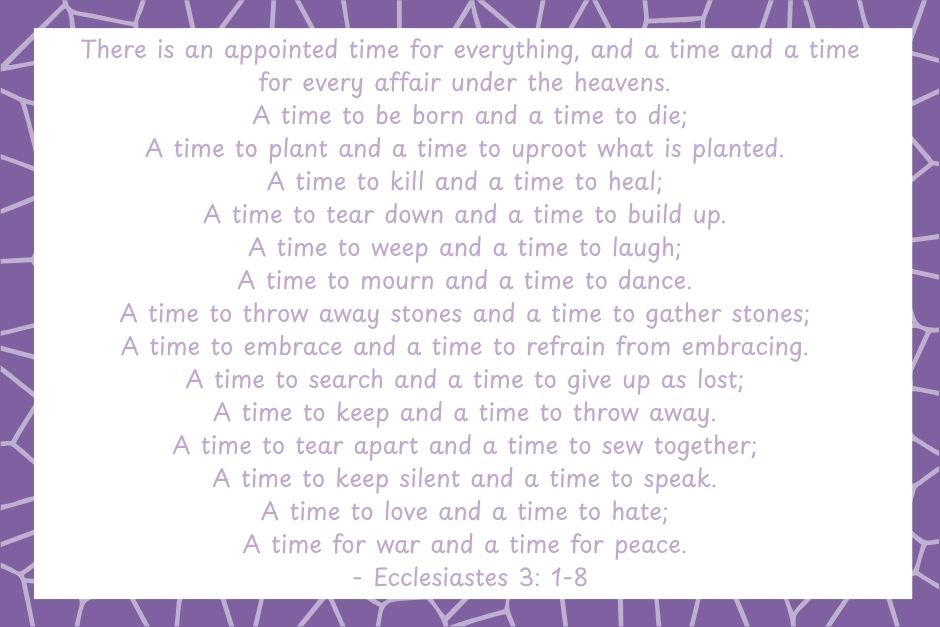 Scripture talks about there being different seasons in life. The biggest example I can think of is one of my favorite Bible verses is Ecclesiastes 3.