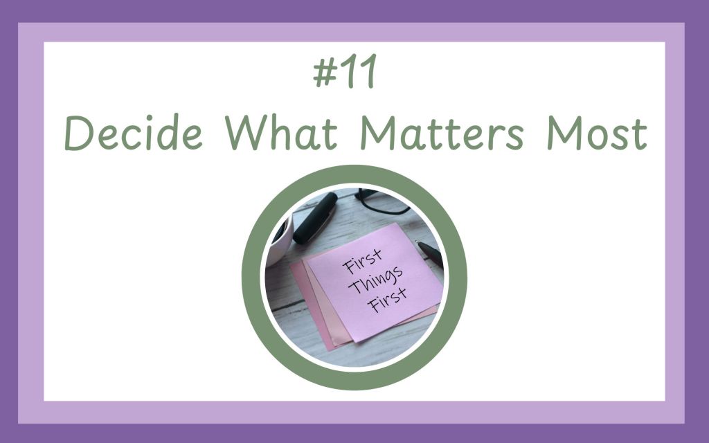 I get very overwhelmed very easily. I’m sure one reason for this is my Bipolar Disorder (read more in Post #7). Another reason is that I struggle with people pleasing. All of that being said, one thing that helps with the overwhelm is that I try to live by the principle “Decide What Matters Most.” Asking myself what matters can be a debilitating question, especially when I am already feeling anxious. Everything feels like it matters. Simply rephrasing the question from, “What matters?” to, “What matters most?” can make a huge difference.